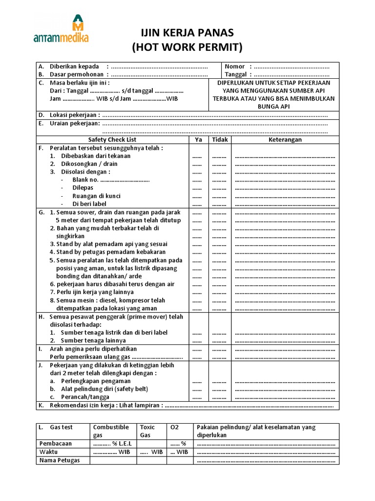 Izin Kerja Panas Hot Work Permit Surat izin kerja panas diperlukan untuk setiap jenis pekerjaan yang berkaitan dengan penggunaan sumber penyalaan yang dapat menyalakan bahan yang mudah terbakar atau kegiatan yang menuntut pekerjaan panas seperti pemotongan menggunakan api pengelasan sandblasting dan pengeboran logam. Work permit ada beberapa macam misalnya izin kerja panas Hot Work Permit izin kerja dingin Cold Work Permit izin kerja memasuki ruang terbatas Confined Space Entry Permit Izin kerja penggalian Izin kerja listrik izin kerja radiografi dan izin bekerja di atas ketinggian. Izin Kerja Panas Hot Work Permit.